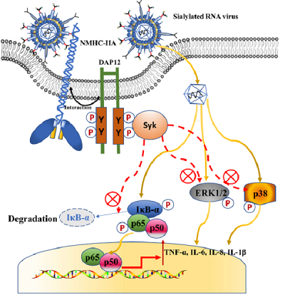 5月7日,校长、中国工程院院士张改平科研团队在《mBio》在线发表了题目为“Nonmuscle Myosin Heavy Chain IIA Recognizes Sialic Acids on Sialylated RNA Viruses to Suppress Proinflammatory Responses via the DAP12-Syk Pathway”的研究论文。论文报道了该团队首次发现在猪繁殖与呼吸综合征病毒(PRRSV)感染早期,宿主细胞膜表面非肌肉肌球蛋白重链IIA能够识别PRRSV主要结构蛋白GP5上的唾液酸,激活DAP12-Syk信号通路,抑制促炎症细胞因子的产生,从而促进病毒复制。