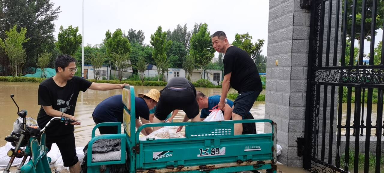 吴亚楠老师所在的河南省开封市通许牧原十四场区,于20日晚上笼罩在风雨雷电之中,仓库开始漏水、险情频发。作为实习带队老师,吴亚楠保证学生安全的同时,带领男生帮助企业搬运物资,减少了因洪灾引发的损失,还主动为场区驻守的抗洪人员运送食物。商艳红老师所在的原阳河南花花牛畜牧科技有限公司,犊牛圈被淹,需要紧急转移犊牛。商艳红带领实习学生参与到转移犊牛的行动中,共转移犊牛70余头,确保了场区犊牛的安全。宋亚鹏老师所在的河南省动物疫病预防控制中心也遭到了暴雨的考验。宋亚鹏带领男生们挥动着铁锹,用泥土袋在门口拉起了一道防洪屏障;女生们拧干拖把,用簸箕和水桶清理掉实验室的渗水,尽最大力量保护实验室内的仪器及样品。项玉强和王彦彬老师所在的豫北某饲料添加剂厂受损严重。两位老师第一时间协调救灾物资,以保证实习生们的饮用水和食物供应,并指导实习生分工协作地帮助场区清理淤泥、转移实验室样品,以减轻企业在洪灾中的损失。