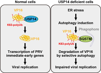 作者进一步解析了抑制 USP14影响PRV增殖的具体分子机制。研究结果表明, USP14在感染早期直接与参与PRV立即早期基因和早期基因转录的VP16被膜蛋白相互作用,使VP16去泛素化,从而稳定VP16有利于PRV复制。抑制 USP14促进VP16 的168位赖氨酸发生K63连接泛素化修饰和蛋白降解。然而此蛋白降解不依赖泛素-蛋白酶体系统,而依赖内质网应激引起的细胞自噬途径。泛素化VP16与选择性自噬受体分子SQSTM1结合后通过自噬溶酶体系统降解。此外,USP14抑制剂在小鼠体内具有较好的预防和治疗PRV 感染的效果。该研究阐明了抑制 USP14 激活 α 疱疹病毒 VP16 选择性自噬降解的分子机制,为治疗α疱疹病毒感染提供了新的药物靶标(图2)。