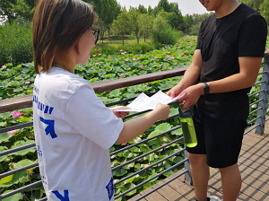 在队长的安排指导下,团队成员有了明确的分工,开始沿着河道捡拾垃圾,接着志愿者对捡拾的垃圾进行分类,志愿者发现堆弃在河边的大都为苹果核、卫生纸等厨余垃圾和其他垃圾。有志愿者表示,虽然现在的人们素质提高了不少,但还是有少部分人不遵守文明,随手乱丢垃圾,作为新时代大学生,我们应严格要求自己,规范自身。团队成员各自有条不紊的进行社会实践。实践过程中通过宣传条幅、发放宣传页等吸引广大市民关注,通过面对面讲解,详细地为大家讲解黄河的悠久历史文化、河流湖泊相关知识以及保护“母亲河”的重要性,号召广大群众积极投身守护母亲河这项伟大的事业之中。通过与路人的交流对话进一步了解了大家对保护黄河生态环境的看法和认识,同时向路人介绍一些保护黄河生态环境的方法和措施,旨在进一步提高市民的环保意识。