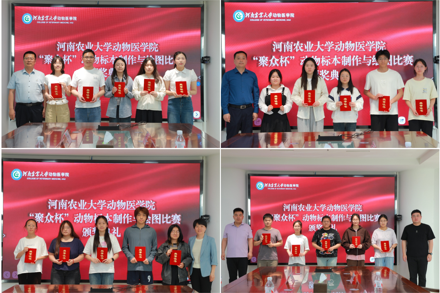 于龙子湖校区第一实验楼北430会议室隆重举行“聚众杯”动物标本制作与绘图比赛表彰大会。山东聚众数字医学科技开发有限公司董事长郑彬龙、院党委副书记杜家方、院基础兽医系主任商艳红、院基础兽医系教师金鑫、院辅导员毛梓丞、毋亚运出席本次大会,获奖学生代表参加。大会由毋亚运主持。