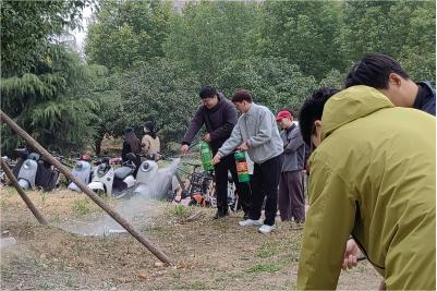 演练现场采取"理论+实操"双轨教学模式系统推进。负责人首先针对灭火毯、干粉及水基灭火器的操作规范及适用场景进行专项讲解,着重强调技术要点:密闭空间内使用干粉灭火器易引发粉尘复燃风险,涉电火情中水基灭火器可能产生导电危害。随后设置仿真火情处置环节,以碎石堆模拟火源,按班级配发三类消防器材展开实战演练。参训研究生严格遵循"提罐体、拔插销、压手柄、瞄根部"的操作规程,在负责人指导下完成灭火全流程作业,现场氛围紧张有序。