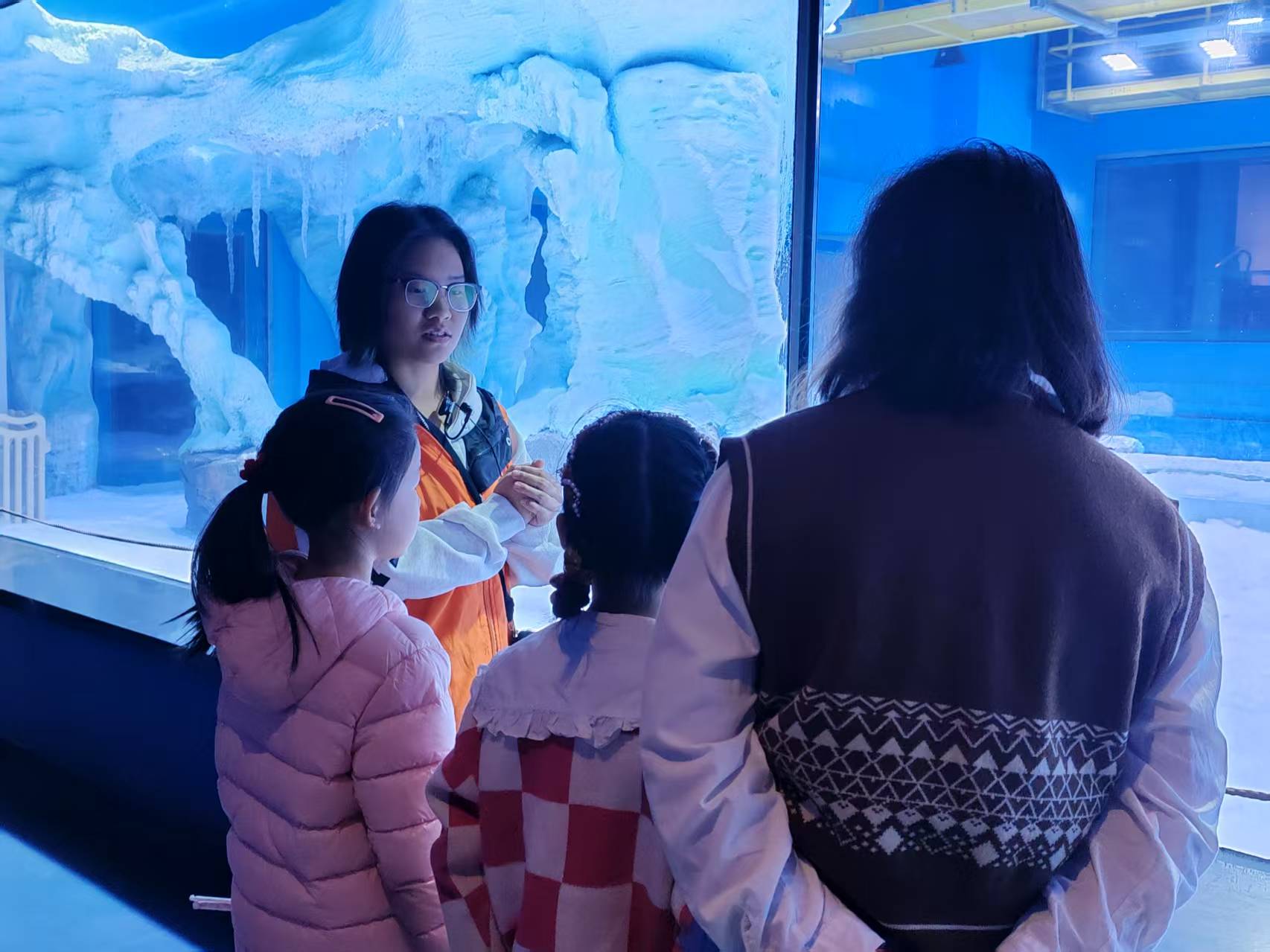 活动中,志愿者分组参与四大主题场馆服务,在梦幻水母馆协助开展水母生命周期科普讲解;于南极企鹅馆进行企鹅知识科普,引导游客文明观赏;在极地动物馆为游客解析北极狐、海豹等动物的适应性特征;奇妙鲸鲨馆内,志愿者则利用专业背景讲解鲸鲨的生理结构及保护现状。学生将课堂理论融入实践,在深化自身知识储备的同时引导众多游客更加了解海洋动物,并倡导大家从点滴做起,爱护海洋生态,保护海洋动物。