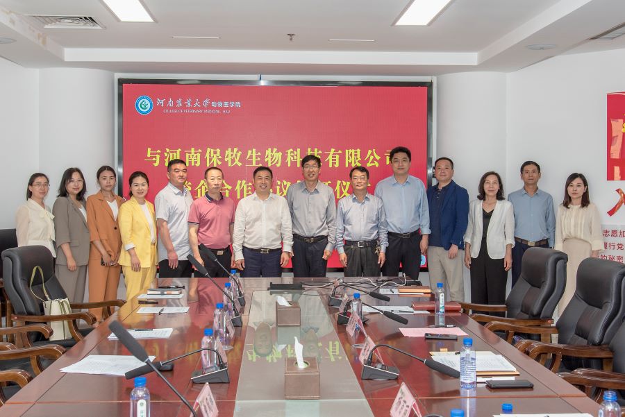与河南保牧生物科技有限公司签订校企合作协议。河南保牧生物科技有限公司总经理张少征、飞默生物总经理曾凤祥、尉氏瑞元饲料公司总经理陈磊、河南畅享农牧有限公司兽医总监安春霞、河南正锐生物科技有限公司总经理张秀玲等一行8人,91a片