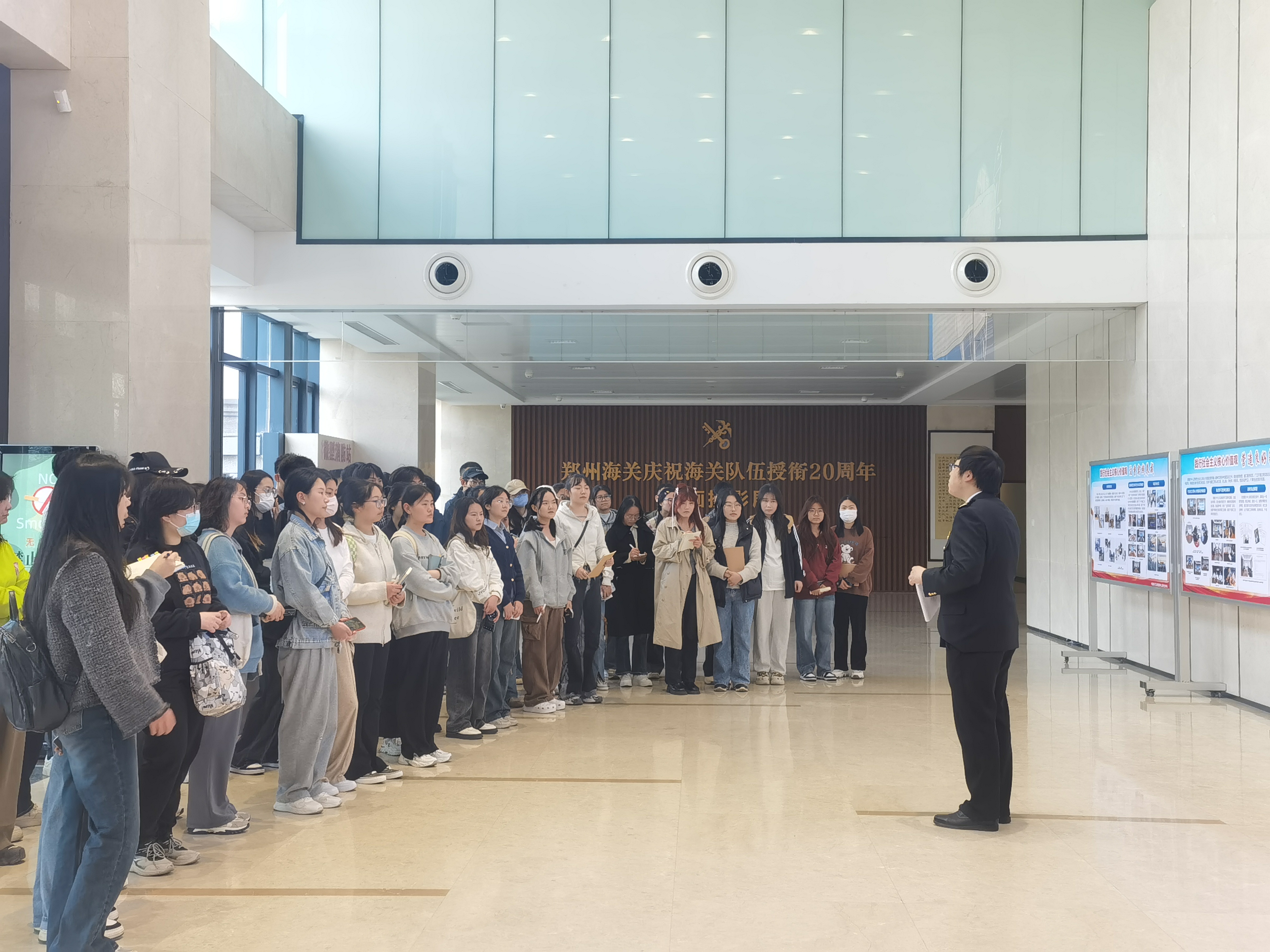 抵达郑州海关技术中心后,同学们首先参观“海关队伍授衔20周年书画展”,对海关制度的建立有了初步的了解。随后在二楼会议室听取了海关知识讲座,讲座由郑州海关技术中心正高级兽医师苗丽担任主讲,苗老师从境外出口隔离场认可、检疫审批、国外预检、现场检疫、隔离检疫、实验室检验、检疫处理、鉴证放行、动植物检疫特性等九个方面,将郑州海关技术中心的主要工作内容和场景进行了详细展示,进一步加深了同学们对海关的认识。