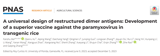 以COVID-19大流行为代表的重大、多发、高发、新发传染病的持续出现,给疫苗研发带来了巨大挑战。这突显了疫苗研发领域对于安全、高效、更低成本疫苗的迫切需求。近日,张改平院士团队在国际知名期刊PNAS在线发表了一篇题为“A universal design of restructured dimer antigens: development of a superior vaccine against the paramyxovirus in transgenic rice”的研究论文,为解决当前疫苗研发领域的难题提供了一项重要的突破性方案。