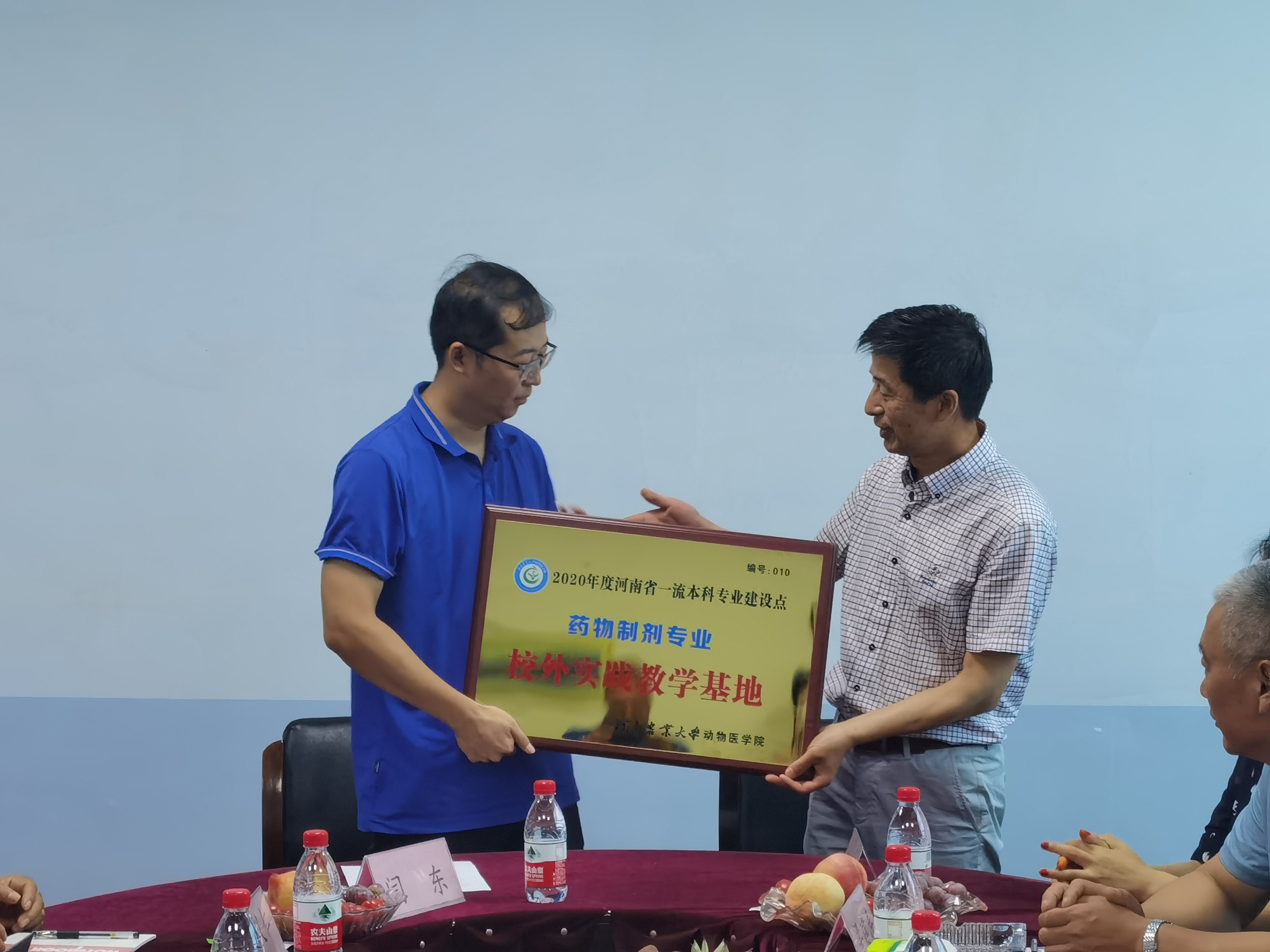 药物制剂专业校外实践教学基地合作协议签订仪式。登封市畜牧业服务中心副主任梁建涛、学院教学副院长韩立强、药物制剂专业教授胡功政及河南白云广牧生物科技有限公司总经理张杲峰等人出席仪式。