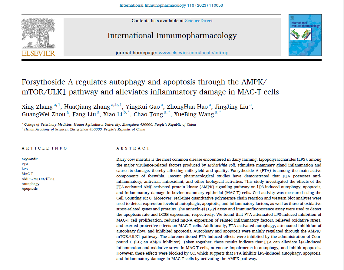临床兽医学科王学兵教授科研团队在中药成分连翘酯苷A、地黄低聚糖的药理机制研究方面取得新进展,相关科研成果以“Forsythoside A regulates autophagy and apoptosis through the AMPK/mTOR/ULK1 pathway and alleviates inflammatory damage in MAC-T cells”、“Oligosaccharides isolated from Rehmannia Glutinosa protect LPS-induced Intestinal Inflammation and Barrier Injury in Mice”为题分别发表在《International Immunopharmacology》(IF:5.714)、《Frontiers in Nutrition》(IF:6.590)等国际知名学术期刊上。王学兵教授为论文通讯作者,临床兽医学科硕士研究生张兴、归荣、张华强,河南省科学院李晓副研究员,临床兽医系青年教师童超博士分别为论文一作或通讯作者。