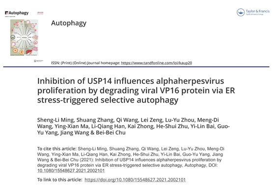 该研究成果以题为“Inhibition of USP14 influences alphaherpesvirus proliferation by degrading viral VP16 protein via ER stress-triggered selective autophagy” 的研究论文在线发表于国际著名期刊Autophagy。褚贝贝教授为通讯作者,我校基础兽医学明胜利、张爽博士和王棋硕士为本文共同第一作者。本研究得到了国家自然科学基金、河南省自然科学基金和91a片