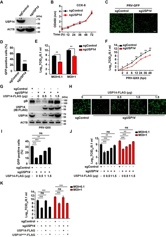 泛素特异性蛋白酶 (Ubiquitin-specific proteases, USPs) 是去泛素化酶中最大的亚家族,在免疫和感染性疾病中发挥重要功能。为了研究USP在α疱疹病毒复制中的作用,作者评估了13种USP抑制剂对PRV复制的影响。结果显示13种USP抑制剂均可抑制PRV增殖,其中USP14抑制剂b-AP15的抑制效果最显著,同时敲除USP14也能抑制PRV增殖(图1)。